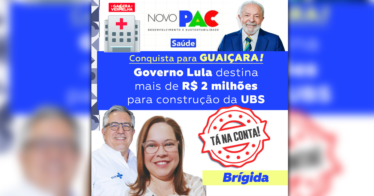 Os recursos já estão na conta do município e são frutos do Novo PAC Saúde. Brígida celebra essa grande conquista agradecendo a parceria do presidente Lula e do ministro da Saúde, Alexandre Padilha, com a população de Guaiçara. A cidade foi contemplada com a unidade durante a primeira etapa do PAC Seleções, anunciada em março de 2024.