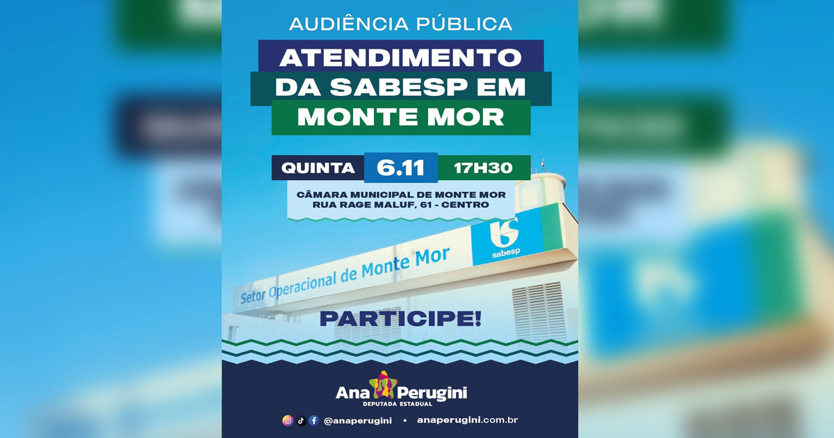 A deputada estadual Ana Perugini promove nesta quinta-feira (6) uma audiência pública para discutir o sistema de atendimento ao público oferecido pela Sabesp aos consumidores de Monte Mor, município da Região Metropolitana de Campinas. O debate, que ocorre após uma série de reclamações encaminhadas por moradores à parlamentar, será realizado a partir das 17h30, no plenário da Câmara Municipal.