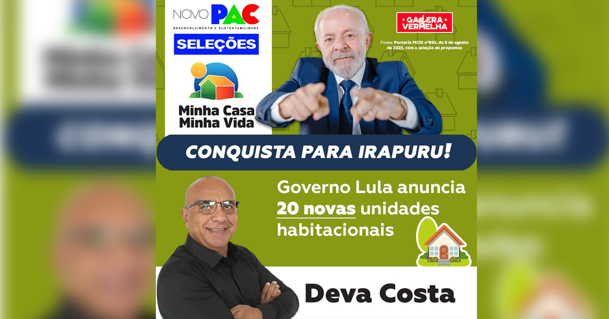 “O Governo Lula segue investindo em Irapuru com as seleções de equipamentos do Novo PAC Saúde e das novas moradias do Minha Casa, Minha Vida para o município. É a confirmação dessa parceria do presidente Lula com o povo da cidade, sempre pensando em melhorar a qualidade de vida de cada cidadão e cada cidadã!”, destaca o presidente do PT, Deva Costa.
