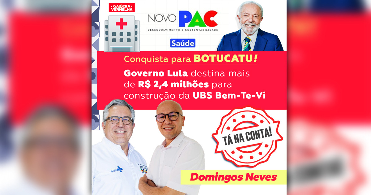 Os recursos já estão na conta do município e são frutos do Novo PAC Saúde. A placa do Governo do Brasil e as obras já estão em andamento. Domingos celebra essa grande conquista agradecendo a parceria do presidente Lula e do ministro da Saúde, Alexandre Padilha, com a população de Botucatu. A cidade foi contemplada com a unidade durante a primeira etapa do PAC Seleções, anunciada em março de 2024.