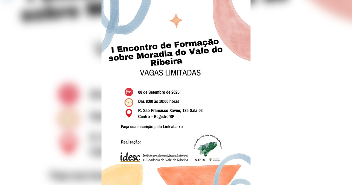 A Comissão de Justiça e Paz da Diocese de Registro, com fundamento em seus princípios pela promoção da Justiça e Paz, e o IDESC (Instituto para o Desenvolvimento Sustentável e Cidadania do Vale do Ribeira), realizam o I Encontro de Formação sobre Moradia do Vale do Ribeira neste sábado (6), das 8h às 16h, no CDP (Centro Diocesano de Pastoral), localizado na Rua São Francisco Xavier, 175 – Sala 03, Centro de Registro.