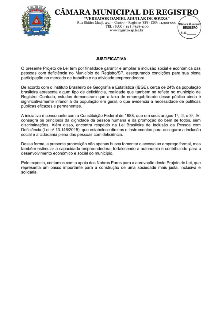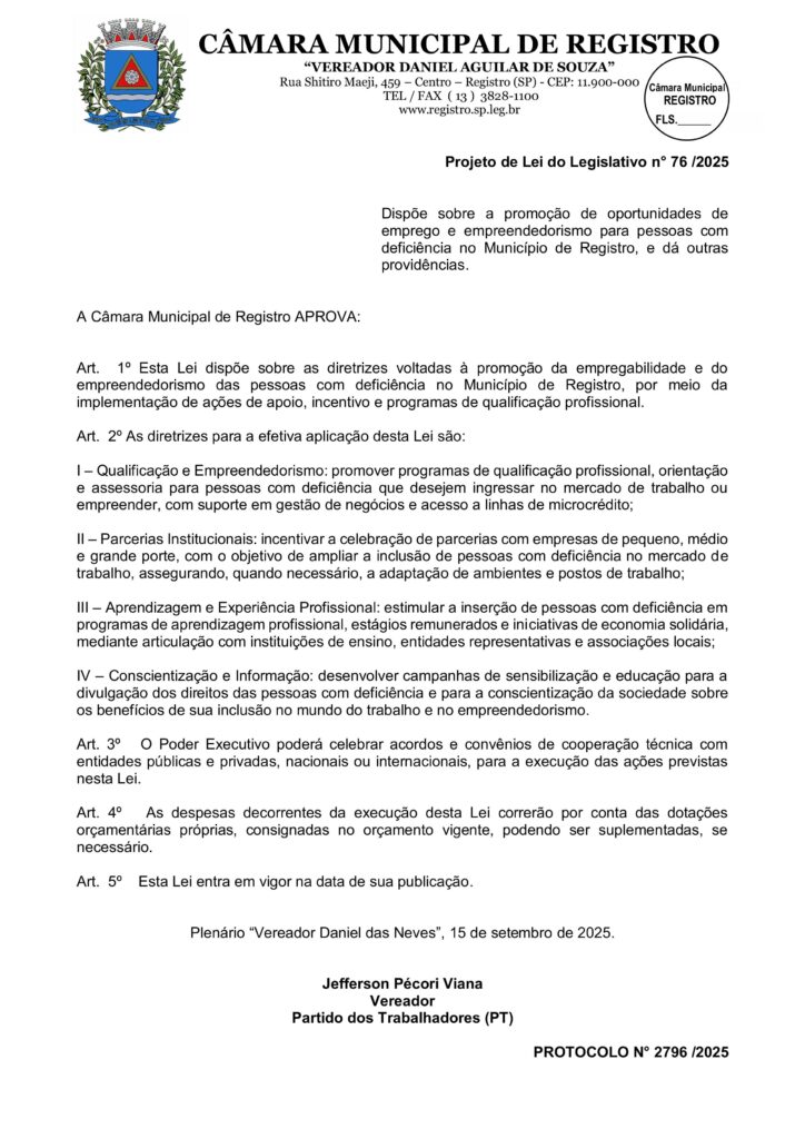 O vereador de Registro (SP), Jefferson Pécori (PT), recordou no último sábado (11/10), Dia Nacional da Pessoa com Deficiência, o PL 76/2025 de sua autoria, aprovado por unanimidade nesta semana pela Câmara Municipal, o qual dispõe sobre a promoção de oportunidades de emprego e empreendedorismo para pessoas com deficiência no município.