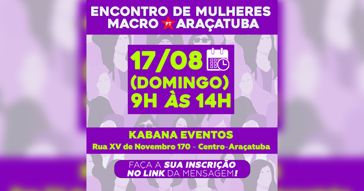 Iniciativa da Secretaria de Mulheres da Macro PT Araçatuba, o Encontro de Mulheres acontece neste domingo (17/8), das 9h às 14h, no Kabana Eventos (Rua XV de Novembro, 170 – Centro – Araçatuba).