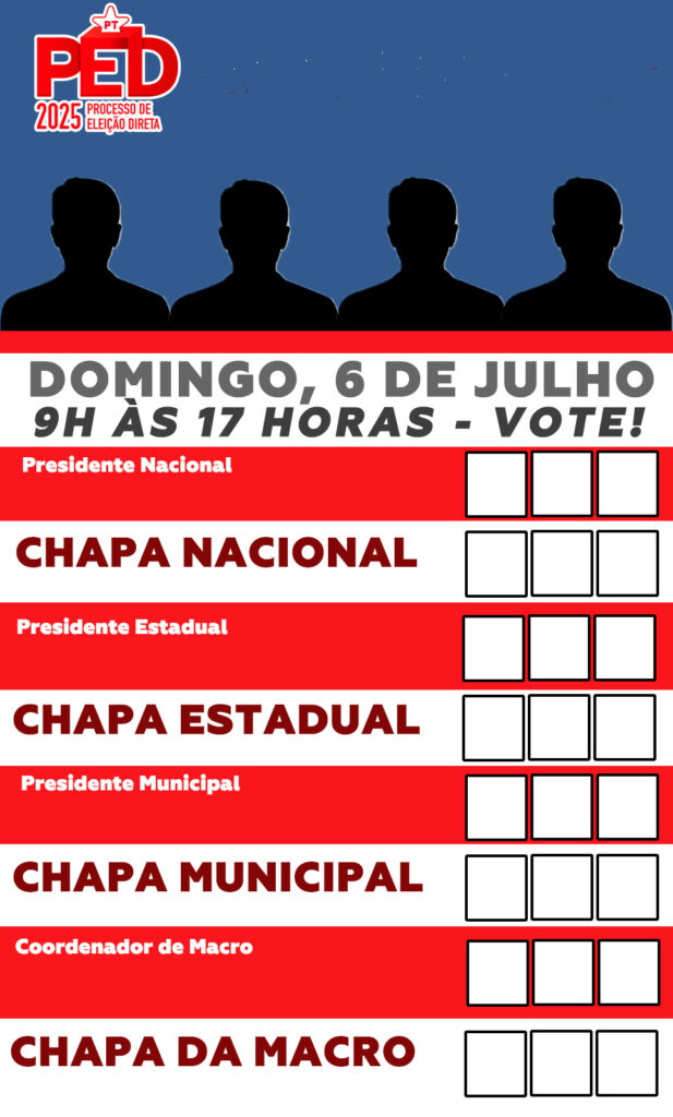 Primeiro, os filiados e filiadas votarão para presidente nacional e chapa nacional; depois para presidente estadual e chapa estadual; em seguida, para presidente municipal e chapa municipal; por fim, para coordenador de macro ou zonal e chapa da macro ou zonal.