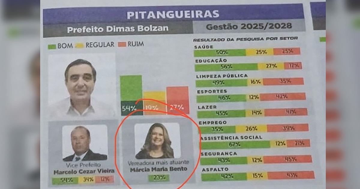 A vereadora publicou em suas redes sociais no último dia 28 de outubro que não conhecia a pesquisa, mas agradeceu à população de Pitangueiras pelo reconhecimento de seu trabalho: “Obrigada aos moradores de Pitangueiras que responderam à pesquisa e citaram meu nome. Vamos juntos! Contem comigo!”, afirmou.