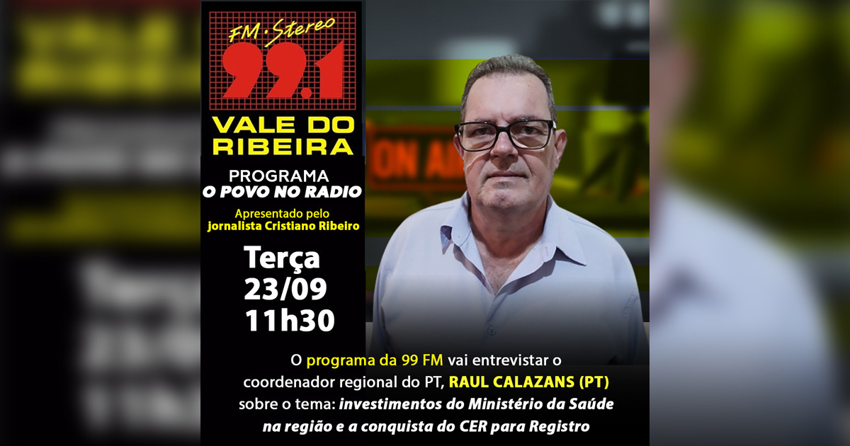 O coordenador regional do PT no Vale do Ribeira e presidente do Conselho Municipal de Saúde de Registro, Raul Calazans, participa na manhã desta terça-feira (23/09), às 11h30, do Programa O Povo no Rádio. Apresentado pelo comunicador Cristiano Ribeiro, a entrevista irá tratar dos investimentos do Ministério da Saúde do Governo Lula na região, como o Agora Tem Especialistas, o Mais Médicos, o Farmácia Popular, o Brasil Sorridente, entre outros, e da recente conquista do CER (Centro Especializado em Reabilitação) para a cidade de Registro.