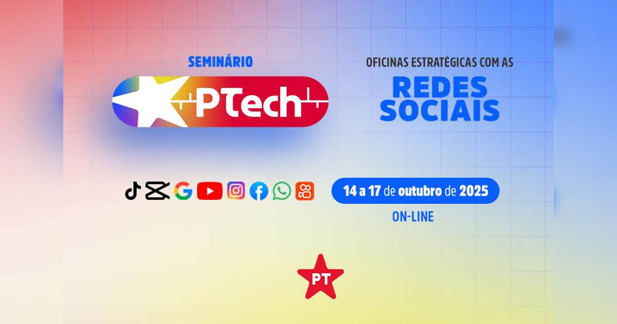 A Secretaria Nacional de Comunicação do Partido dos Trabalhadores (SECOM/PT) convoca a militância e secretários de Comunicação para o “Seminário PTech: Oficinas Estratégicas com as Redes Sociais”, que acontecerá em Brasília entre os dias 14 e 17 de outubro de 2025. Mas atenção, as vagas são limitadas. Faça já a sua inscrição: clique aqui.