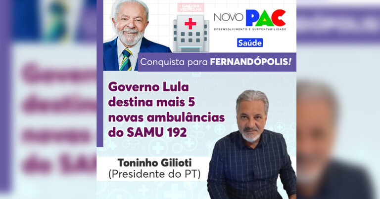 Toninho Gilioti: Governo Lula contempla Fernandópolis com mais cinco ambulâncias do PAC Saúde