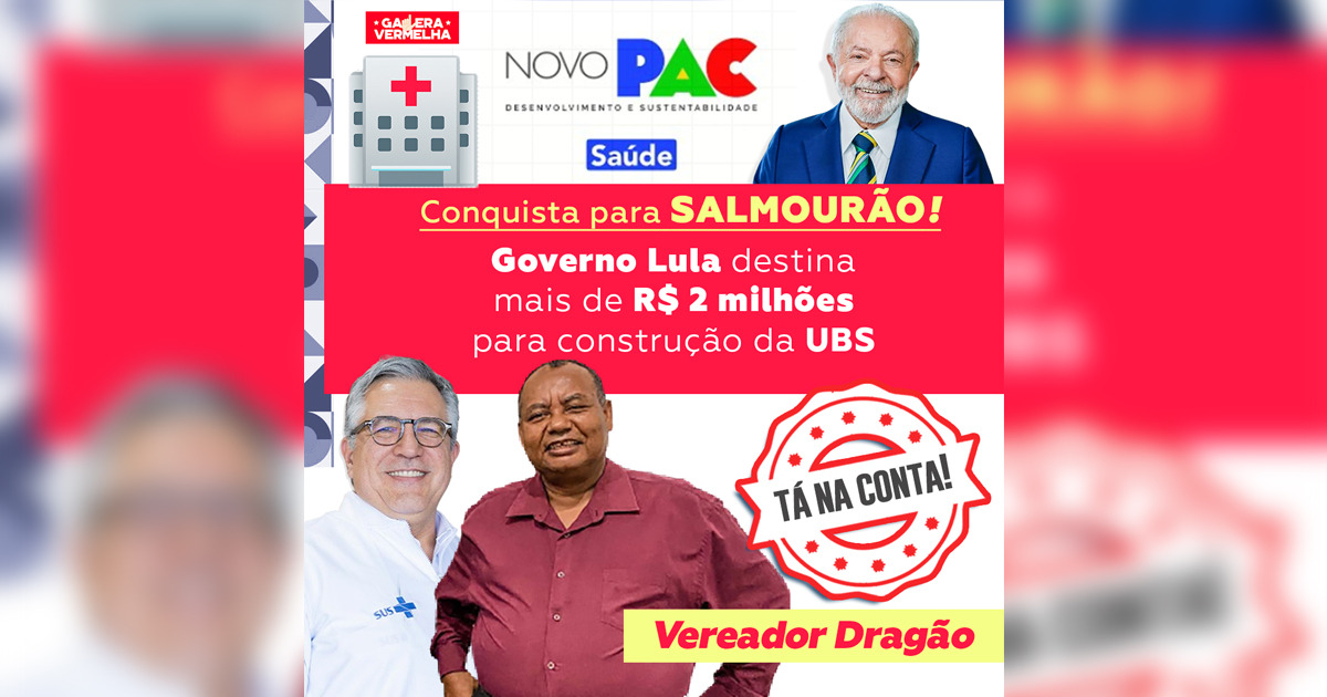 Vereador Dragão anuncia grande conquista para Salmourão: “Governo Lula destina mais de R$ 2 milhões para a construção da UBS”