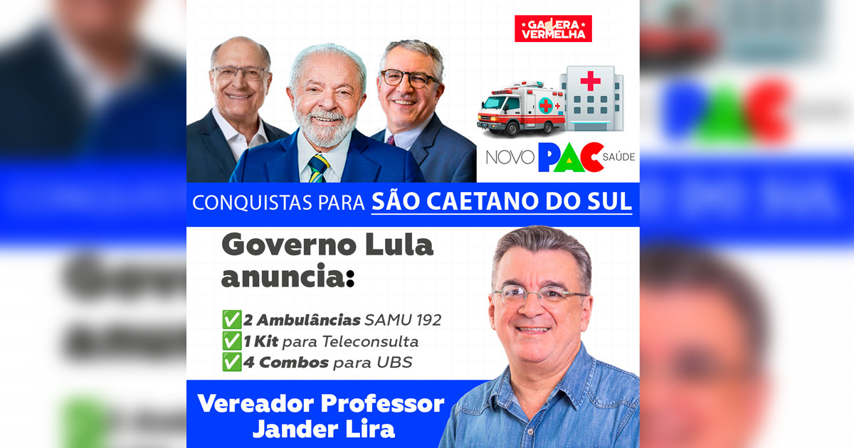 O vereador de São Caetano do Sul (SP), Professor Jander Lira (PSB), repercutiu no mês passado, as grandes conquistas do Novo PAC Saúde para a população sul-caetanense, fruto da parceria do Governo Lula  e da articulação do mandato com o vice-presidente da república, Geraldo Alckmin (PSB),e com o ministro da Saúde, Alexandre Padilha (PT): 2 Ambulâncias para Renovação de Frota do SAMU 192, 4 Combos de Equipamentos para UBS e 1 Kit para Teleconsulta, anunciados no mês de julho.