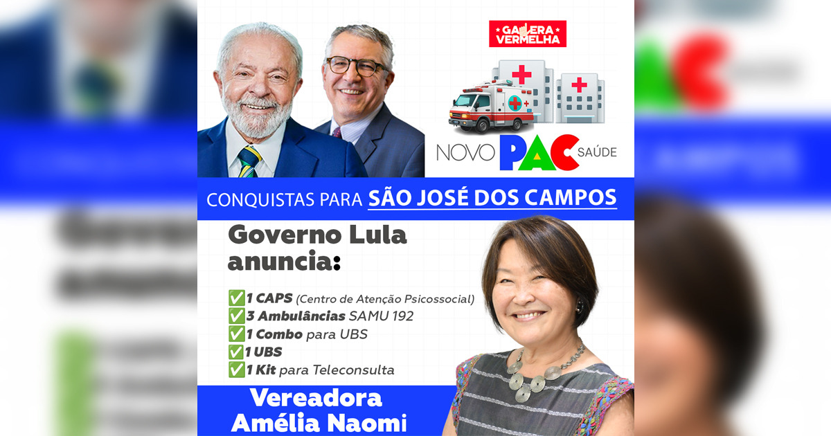 A vereadora de São José dos Campos, Amélia Naomi (PT), recordou nesta terça-feira (29/7) grandes conquistas para a população, fruto da parceria do Governo Lula através do Novo PAC Saúde, anunciado neste mês de julho com mais de R$ 7 milhões em investimentos para o município do Vale do Paraíba.