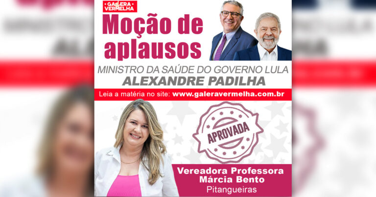 A Câmara de Pitangueiras (SP), na Região Metropolitana de Ribeirão Preto, no estado de São Paulo, aprovou neste mês de março, por unanimidade, moção de aplausos apresentada pela vereadora Professora Márcia Bento (PSD), ao deputado federal licenciado Alexandre Padilha (PT), pela nomeação como ministro da Saúde do Governo Lula. “É de grande valia e importância ter … Continue lendo Vereadora Professora Márcia Bento: Câmara de Pitangueiras aprova moção de aplausos ao ministro Alexandre Padilha
