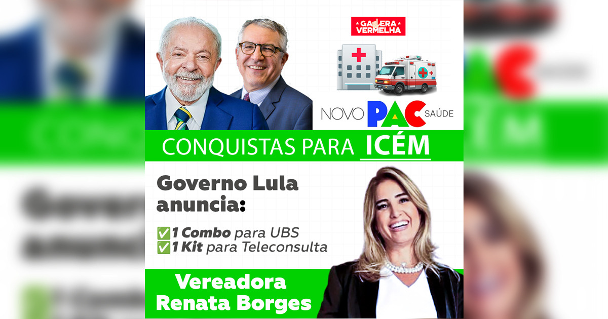 “A população de Icém agradece ao Governo Lula pela destinação de recursos do Novo PAC Saúde para a nossa cidade. Gratidão ao presidente Lula e ao ministro Padilha”, destaca Renata Borges.